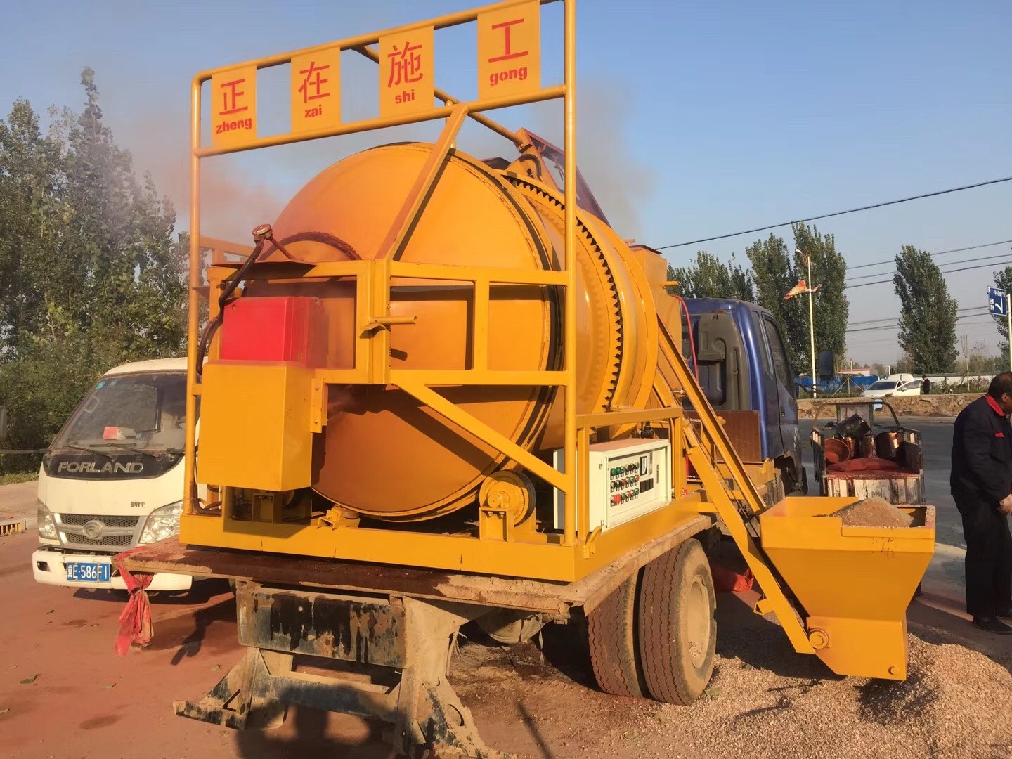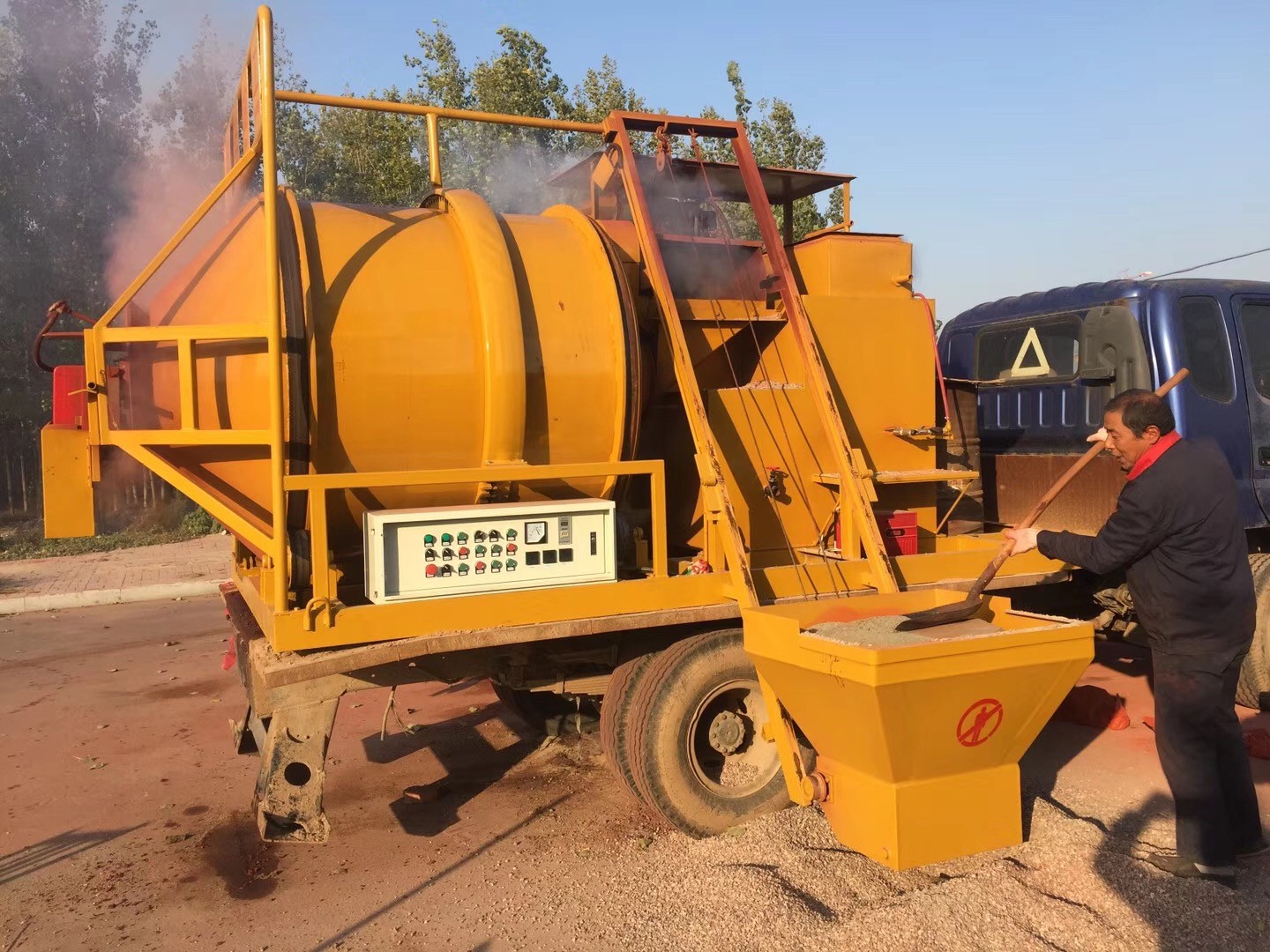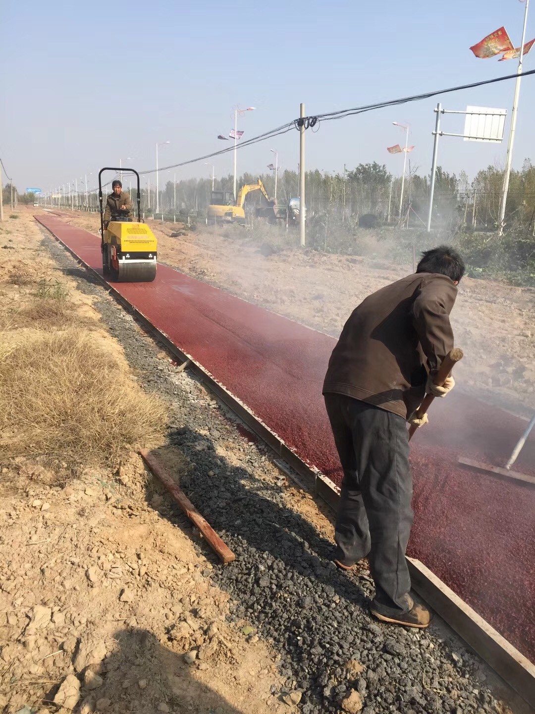 小型沥青搅拌站生产各种彩色沥青混合料,现场生产,直接摊铺。座驾式压路机双驱单振,自动洒水,压实效果好。